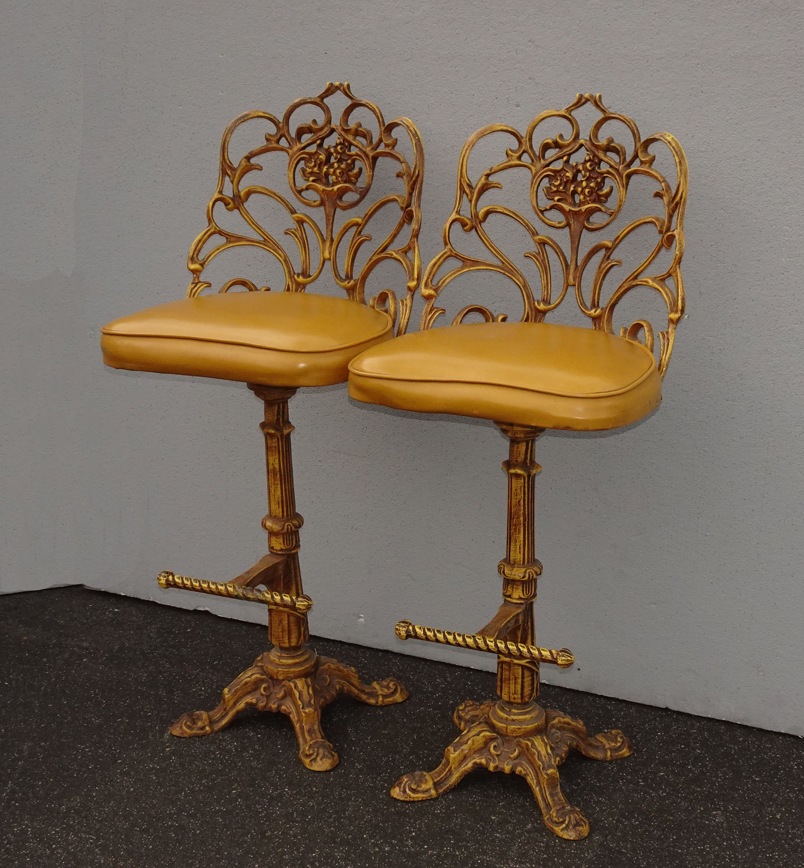 Cast Iron Bar Stools. It includes a round, padded seat covered with leather. Bar height can be cut down to counter height if needed. Spectacular set of three cast iron bar stools made in the french art nouveau style. This bar stool stands on a durable cast iron frame finished in black color.