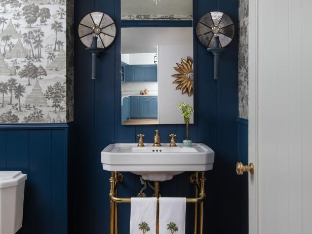 Dark Blue Powder Room. One idea that we particularly love in here from the many below is the use of malachite. Paintings of boats and fish are very common, and the use. Transitional powder room with light blue dresser style vanity in otherwise all white powder room except for the very light wood flooring. Navy blue and white combined in the spacious modern powder room with ease.