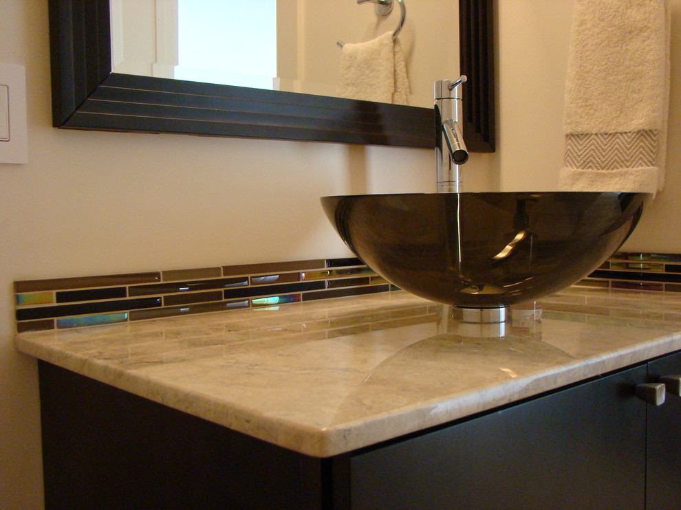 Mixing calacatta marble onto the floor and base of your bath speaks of a modern sophistication. Fabulous blue glass vessel sink and glass vanity.