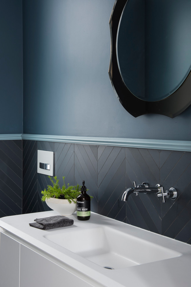 Using simple molding and paint everything else from the hexagon wall mirror to the floating shelf with a metal and glass jointed vase. Smoky glass gives these powder room sconces intriguing presence. A sultry blue covers the walls and a swirled tile finishes out the floor to create a. The designer paired it with a water texture glass countertop and silver and blue venetian glass mosaic tiles which run vertically from the floating.
