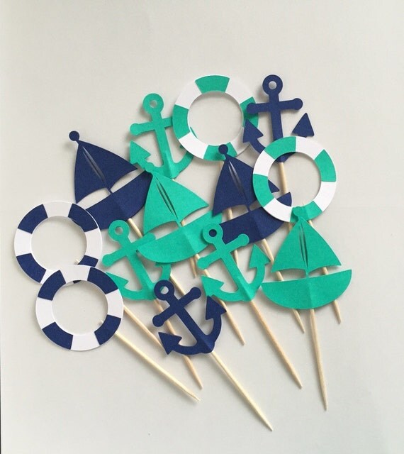 Nautical Themed Cupcake Toppers. 5.0 out of 5 stars based on 3 product ratings(3). Nautical theme blue shark cake topper happy birthday party decoration ocean wave cupcake wrapper baby shower party supplies. These toppers can be made in any color of your choice. Nautical themed party cupcake topper, ahoy it's a boy baby shower dessert decor, sailboat cupcake toppers, boy birthday party decorations.