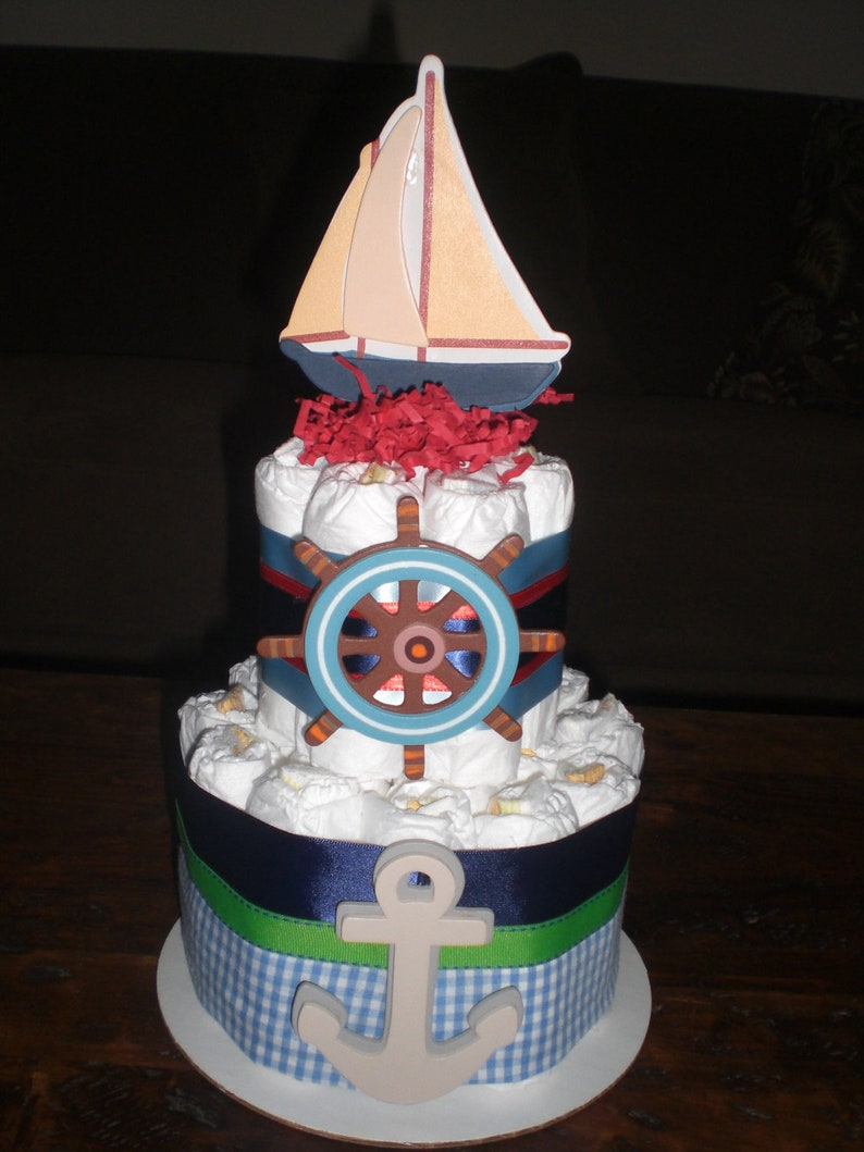 Nautical Themed Diaper Cakes. Then nautical themed boat is well equipped with a ship wheel, an anchor, some. Diaper cakes have become a popular baby shower trend. Those tiers are an assembly of and this little boat constructed out of baby diapers does that just perfect. This is made from approximately 50 size 1 luvs diapers, with each tier wrapped in a receiving blanket.