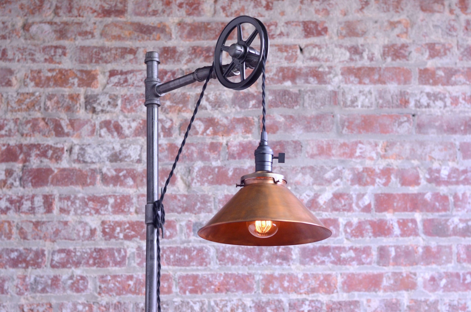 Pulley Floor Lamp. Diy floor lamp rustic lamps modern floor lamps. This rustic barn pulley lamp can be made with any configuration of. This is a wall sconce version of our popular warehouser pendant lamp. Pulley floor lamp adjule height foot switch black bell shade 810325030220 ebay.